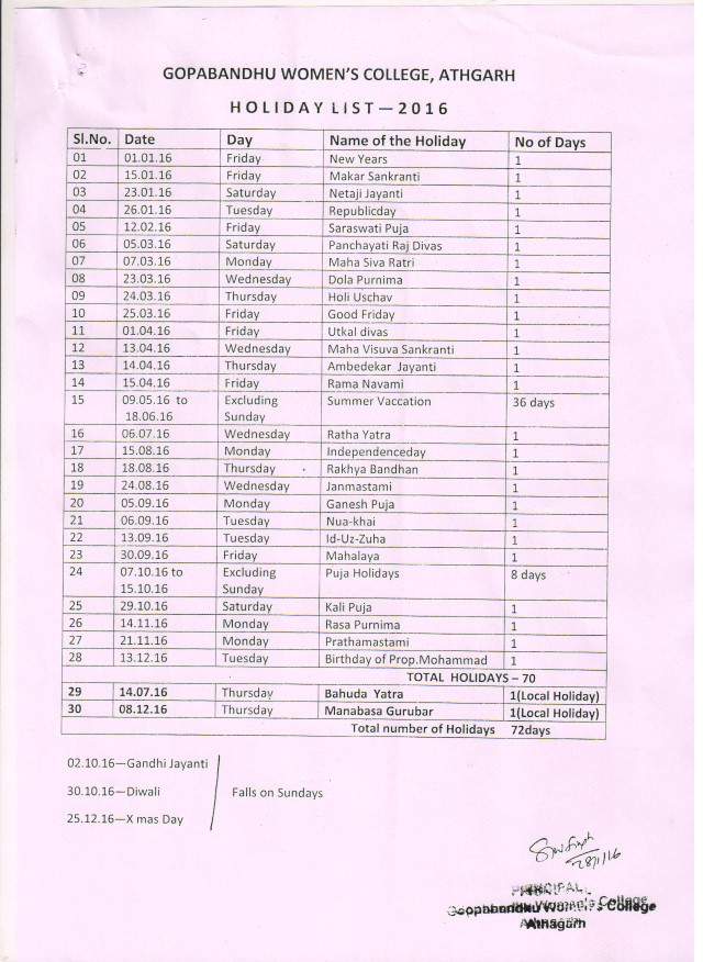 Academic Holidays for the year 2015-16
